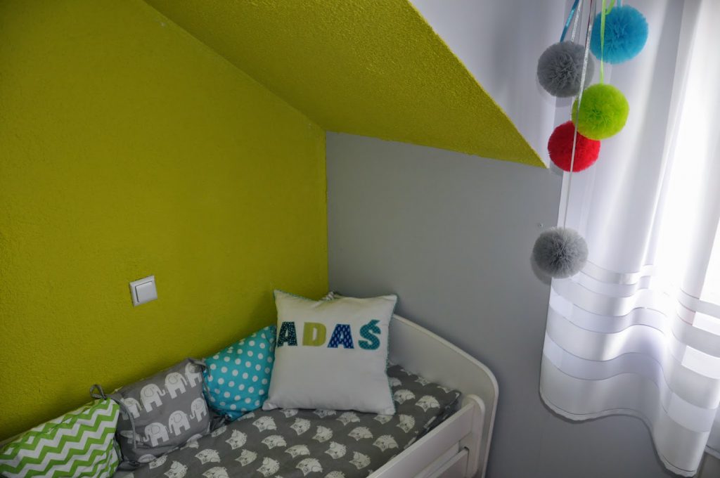 Julka łóżeczko stoi przy ścianie, bok ozdobiony jest małymi, kolorowymi poduszkami, które połączone troczkami przylegają do ramy łóżeczka. Ściana jeszcze jest dość pusta, ale jesteśmy w trakcie urządzania pokoiku. Z pewnością niedługo zobaczycie kolejną odsłonę Julka pokoju.