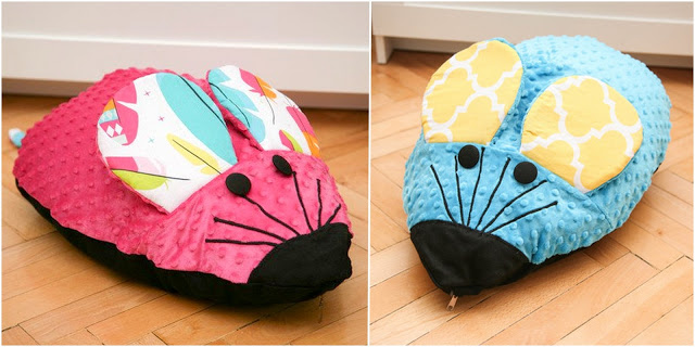 Mamy tez poduszeczki, które z jednej strony uszyte są z bawełny, z drugiej zaś z mięciutkiego minky. Uwielbiamy na nich leżeć. Juluś nawet kiedy kładzie się na dywanie,w swoim domku stworzonym z kocy, zawsze zabiera swoje minkowe podusie.