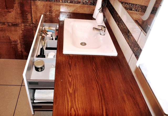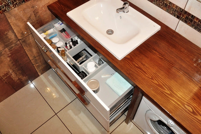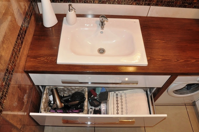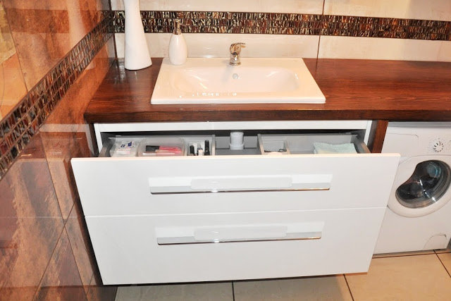 została wpuszczona umywalka, a pod którym znalazła się szafka wisząca i pralka. Dzięki temu łazienka wygląda świetnie, a ja mam dużo dodatkowego