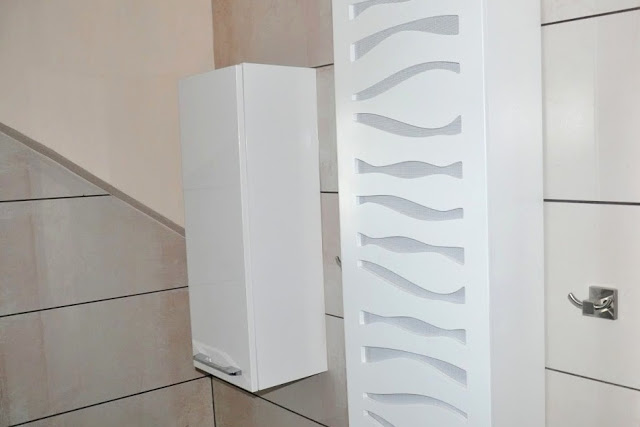Dwie wiszące szafki Barcelona powieszone na dwóch przeciwległych ścianach nie tylko nie zmniejszyły optycznie łazienki, ale pozwoliły zorganizować miejsce na dodatkowe kosmetyki.