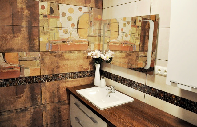 Rudobrązowe i kremowe, wyraziste i bardzo stylowe płytki zwyciężyły nad klasyką. Piękne, wielkoformatowe i prostokątne płytki (90cmx30cm) stworzyły eleganckie tło, a ułożone poziomo optycznie poszerzyły przestrzeń. Dekory Vertigo, które wykorzystaliśmy na dwóch przeciwległych ścianach wydały się być stworzone przez prawdziwego artystę za pomocą pociągnięć malarskiego pędzla. To piękne obrazy, które tworzą we wnętrzu niesamowity, artystyczny klimat, a jednocześnie przedstawiają łazienkę w bardzo nowoczesnej formie. Całość uzupełniliśmy szklaną mozaiką Tesoro, która jeszcze bardziej wyróżniła wnętrze.