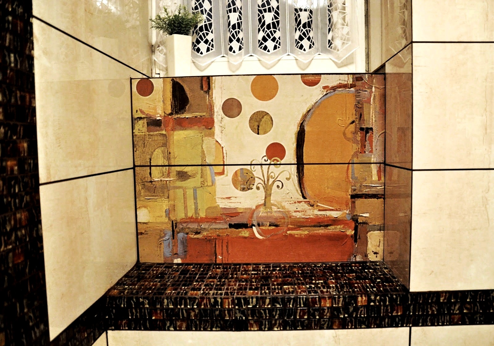 Rudobrązowe i kremowe, wyraziste i bardzo stylowe płytki zwyciężyły nad klasyką. Piękne, wielkoformatowe i prostokątne płytki (90cmx30cm) stworzyły eleganckie tło, a ułożone poziomo optycznie poszerzyły przestrzeń. Dekory Vertigo, które wykorzystaliśmy na dwóch przeciwległych ścianach wydały się być stworzone przez prawdziwego artystę za pomocą pociągnięć malarskiego pędzla. To piękne obrazy, które tworzą we wnętrzu niesamowity, artystyczny klimat, a jednocześnie przedstawiają łazienkę w bardzo nowoczesnej formie. Całość uzupełniliśmy szklaną mozaiką Tesoro, która jeszcze bardziej wyróżniła wnętrze.