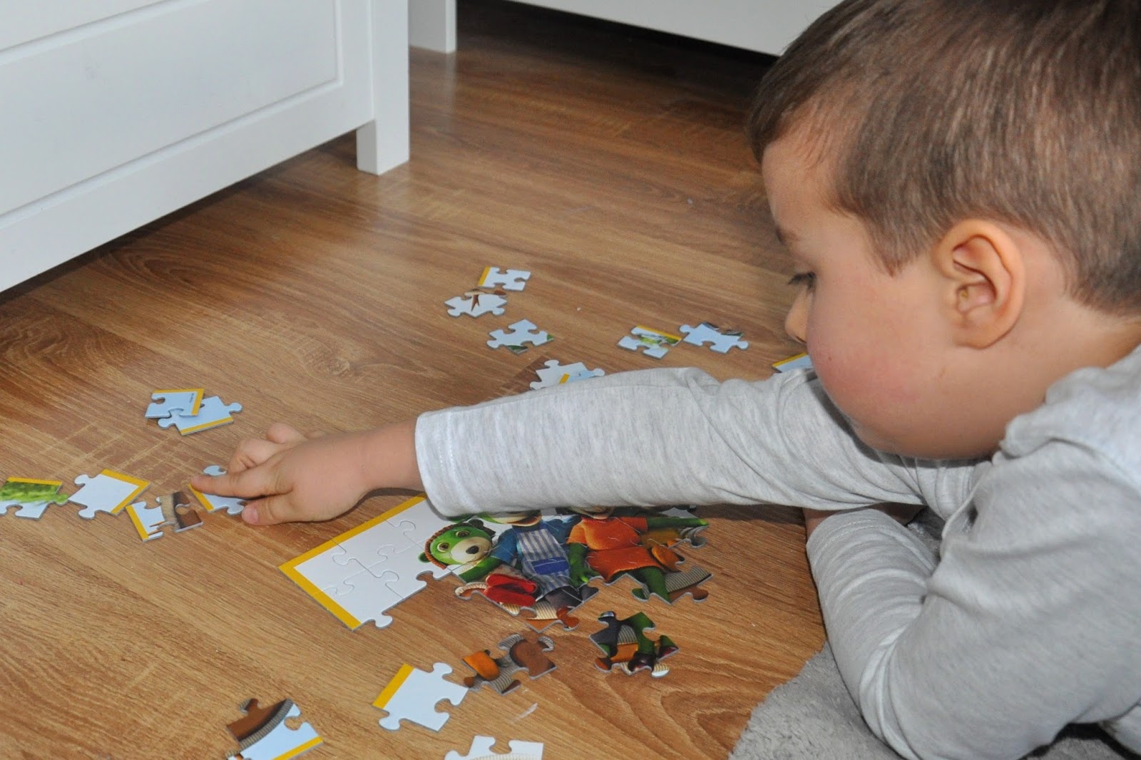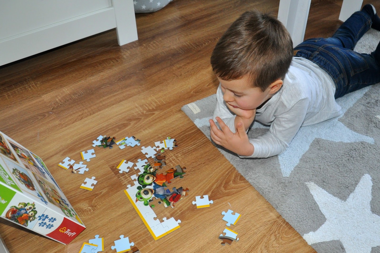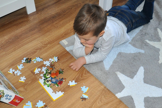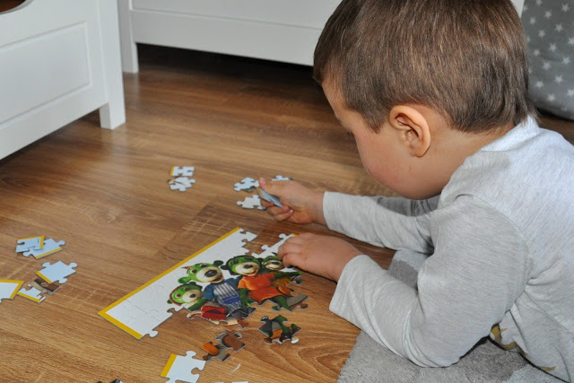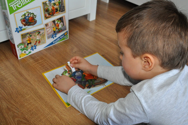 Bardzo lubimy też Treflikowe puzzle, z których część układamy wspólnie, a są też takie, które Julcio układa samodzielnie 🙂 Dla najmłodszych dzieci możemy wybrać Puzzle Maxi, składające się z 24 bardzo dużych elementów, a dla tych troszkę większych: Rodzinne Śniadanie, Zabawę w Indianina, Kolorowy wiatraczek i zestaw z czterema Przygodami Treflików.