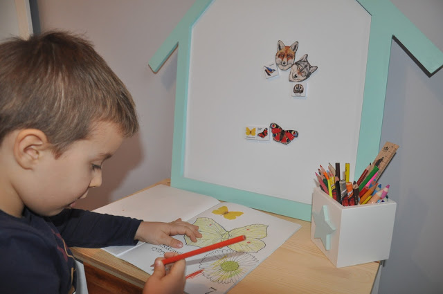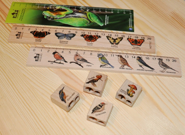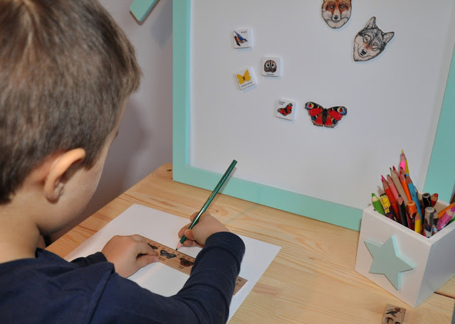 Przepiękne gadżety zachwyciły nie tylko mnie, ale też chłopaków. Stworzone z dbałością o każdy szczegół linijki i strugaczki, nie są zwyczajnymi przyborami szkolnymi. Mają cel i misję, które bez wątpienia spełniają – uczą i bawią najmłodszych! Kiedy Julcio podczas rysowania złamał kredkę, poprosił o strugaczkę z zimorodkiem! A drewniana linijka z namalowanymi motylami i ptakami pozwoliła nam na poznanie i rozróżnienie tych stworzonek. Piękne, naturalne magnesy nie tylko zdobią nową tablicę magnetyczną Julcia, ale również są wykorzystywane do mocowania jego prac plastycznych.