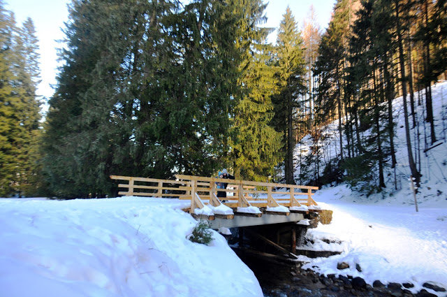 Ostatnia część trasy do schroniska jest troszkę trudniejsza niż początek, a to ze względu na to, że dłużej się idzie pod górkę. Juluś zaczynał coraz bardziej odczuwać zmęczenie i do schroniska dojechał już na saneczkach. Wędrówka po oblodzonej drodze z sankami i ponad 20 km synkiem nie była najłatwiejsza, ale lepiej ciągnąć go na sankach, niż nieść na rękach 🙂