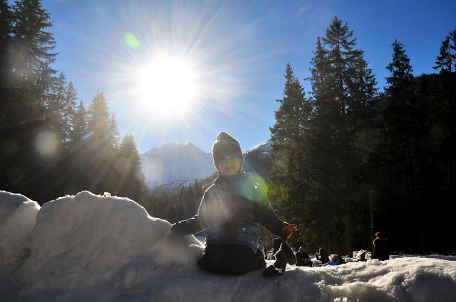 Jak tylko zobaczyliśmy „chatkę w lesie” Julek zeskoczył z sanek, natychmiast nabrał energii i radośnie biegał w śniegu. Widok przed schroniskiem zapierał dech w piersiach. Dosłownie. Jeszcze ta cudna pogoda…