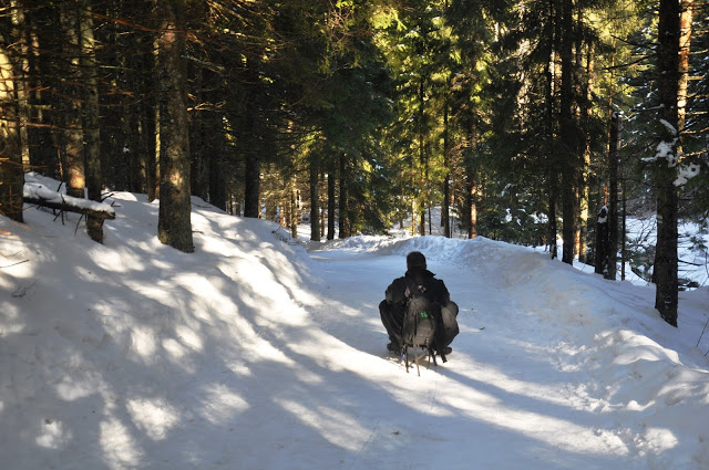 W Schronisku na Hali Ornak spędziliśmy prawie godzinę. Droga powrotna była znacznie szybsza. Chłopaki zjechali na sankach, co jakiś czas zatrzymując się i czekając na mnie. Zdarzały się naprawdę długie zjazdy, Juluś aż krzyczał z radości, machał nóżkami, skakał na saneczkach. Przez cały sezon zimowy nie pojeździł na sankach tyle, co tego dnia.