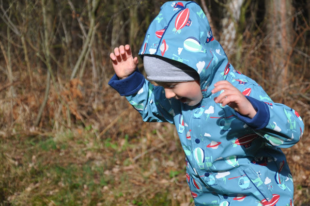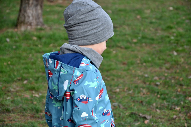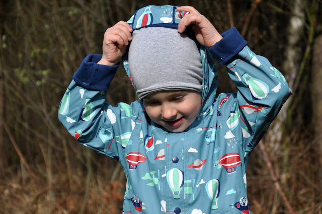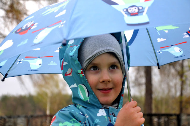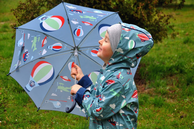 Juluś ma na sobie płaszczyk przeciwdeszczowy Penny Scallan, który jest nie tylko śliczny, ale przede