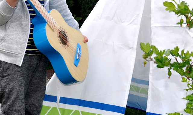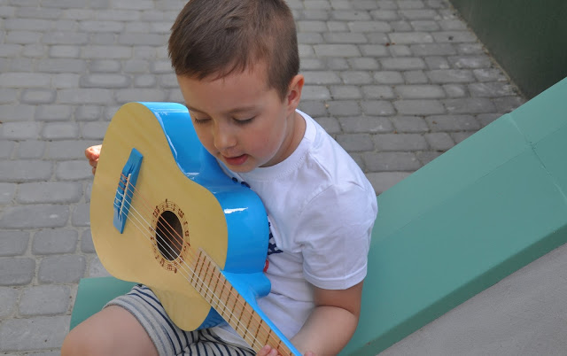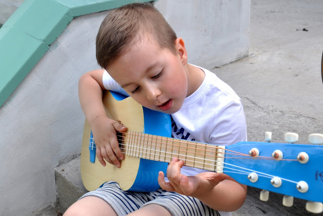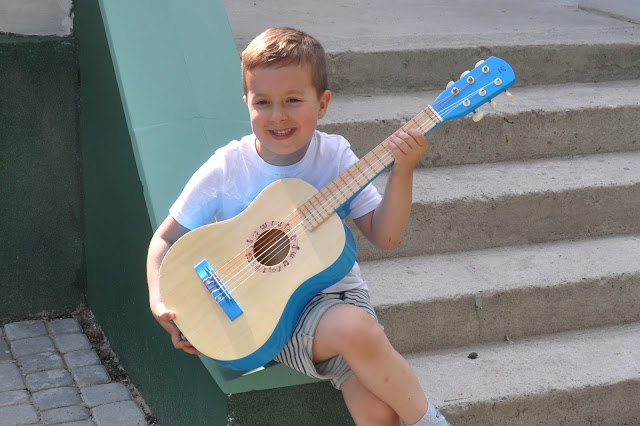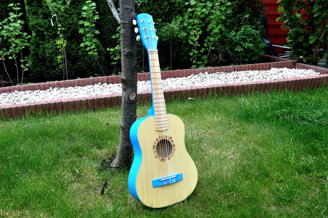 To, że Juluś kiedyś zacznie naukę gry na gitarze było oczywiste. Ja sama kiedyś próbowałam grać, ale za stronę muzyczną w naszej rodzinie zdecydowanie odpowiada tata 🙂 Prawdziwa, duża gitara, którą mamy w domu nigdy nie stała zakurzona w kącie. Tomek często gra i bardzo często pomagał mu w tym Julcio 🙂 Teraz i on doczekał się swojego pierwszego „prawdziwego” instrumentu i bardzo mu się podoba. Do tego ma elementy w jego ulubionym, niebieskim kolorze! Gitara Hape nie jest zabawką, a prawdziwym instrumentem – profesjonalnym pudłem ze strunami, tylko że w mniejszym wydaniu. Liczę na to, że Julcio szybko opanuje podstawowe chwyty i już niedługo będę mogła słuchać koncertu moich dwóch chłopaków, z dwiema gitarami 🙂 Za kilka dni, jak w każdy pierwszy weekend czerwcowy, wyruszymy na Harcerski Rajd Świętokrzyski. W tym roku, przy wieczornym ognisku, wśród wielu instrumentów, zabrzmi również dźwięk niebieskiej gitarki Julusia 🙂