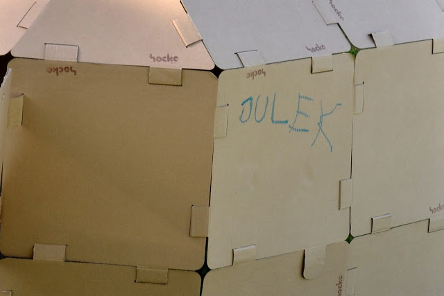 Klocki wykonane są z tektury i mają jej naturalny odcień. Mnie się bardzo podoba brak wielu kolorów i szczegółów, Julcio natomiast postanowił nieco ozdobić brązowe kwadraty i udekorował je farbkami w sztyfcie. Na niektórych zdjęciach zobaczycie, że klocki nawet zostały podpisane 😉