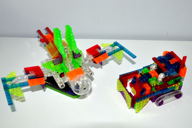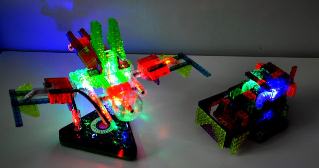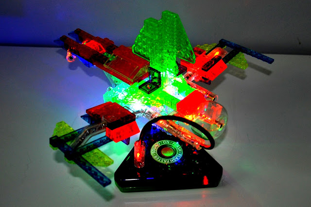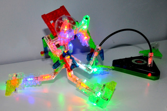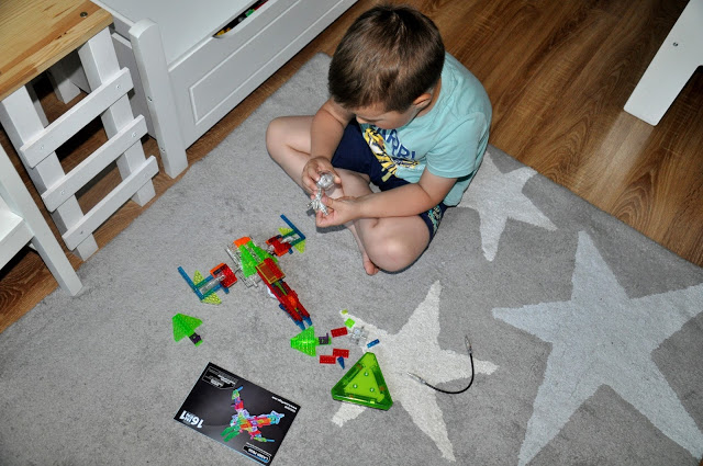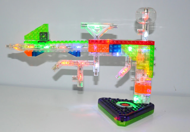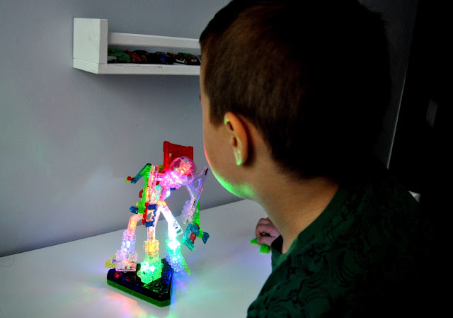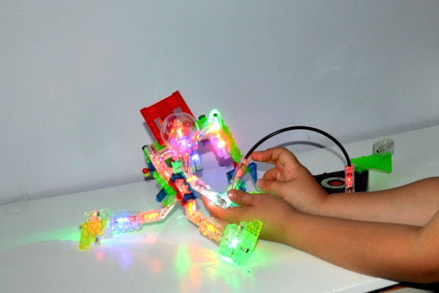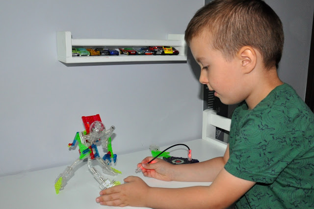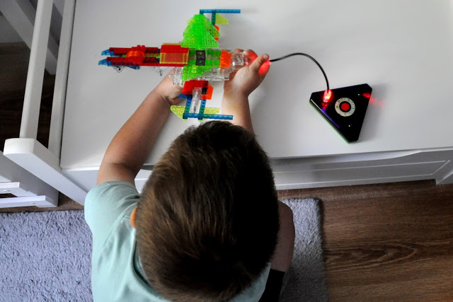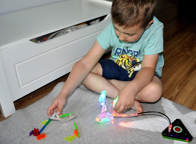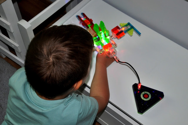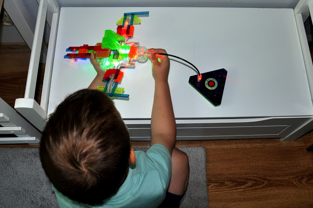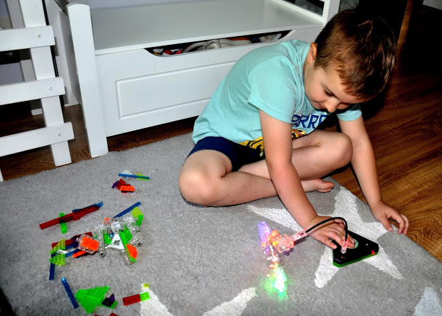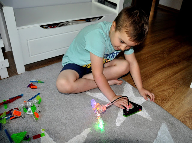 Kabelki, przewody, bazy, kolorowe ledy umożliwiają nieograniczoną liczbę połączeń pomiędzy poszczególnymi elementami. Co więcej, klocki nie tylko rozwijają wyobraźnię dzieci, ale też pozwalają poznać im prawa fizyki. Ja się czasem śmieję, że rośnie mi nie tylko mały architekt, ale też elektryk 🙂