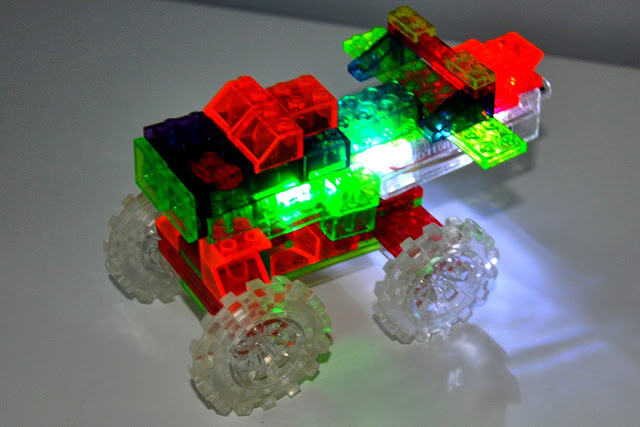 Jak to działa? Każdy zestaw wyposażony jest w kilka klocków bazowych z diodami LED. Budujemy pojazdy, budowle i co tylko wyobraźnia podpowie, wykorzystując elementy ze światełkami i pozostałe klocki z zestawu. Kiedy konstrukcja jest gotowa, wystarczy włączyć światło w klocku bazowym i dzięki niemu dochodzi do rozprowadzenia barw po całej konstrukcji. Efekt jest niesamowity 🙂