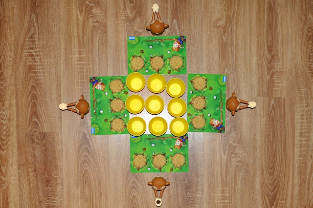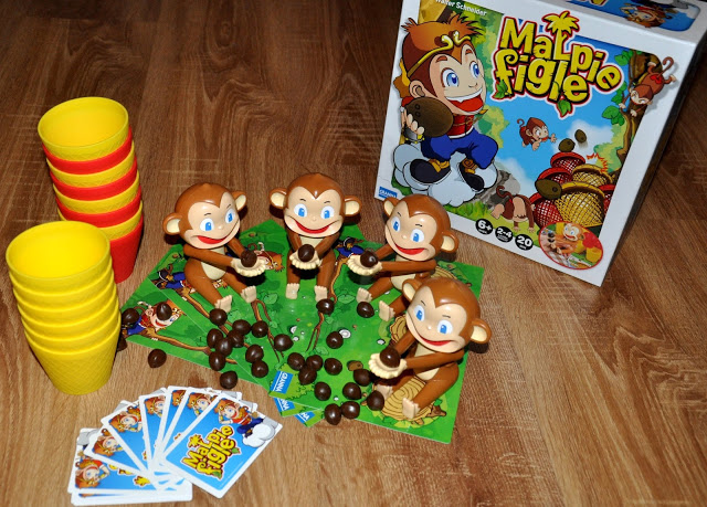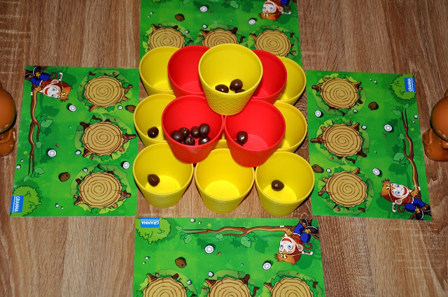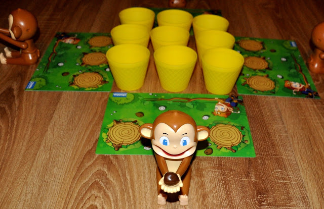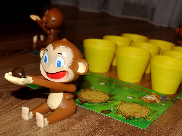 Dużo gramy i często pokazuję Wam różne propozycje na tego rodzaju wspólną zabawę. A jak już jesteśmy przy grach Granna, to chcę Wam pokazać jeszcze jednej mój hit – może niekoniecznie na podróż samochodem, ale na wesołą zabawę podczas wakacji (albo jesiennego wieczoru w  domu – a to wkrótce nas czeka) – Małpie figle, czyli gwarancja śmiechu i doskonałej zabawy! Cztery psotne małpki strzelają kokosami do kubeczków. Kokosy lądują gdzie popadnie – na podłodze, dywanie, biurku, parapecie, a nawet w talerzu z zupą! I celem gry nie jest strzelanie do „niebezpiecznych” celów, a trafianie do kolorowych pojemniczków!