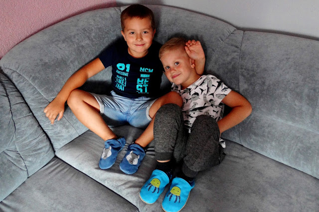 Julcio po domu zazwyczaj chodzi boso albo w samych skarpetkach – tylko zimą lubi mieć coś więcej na stópkach i wtedy zakłada buciki. Również kiedy jedzie do dziadków czy na dodatkowe zajęcia z języka angielskiego ma na nóżkach kapcie. I to nie byle jakie 🙂