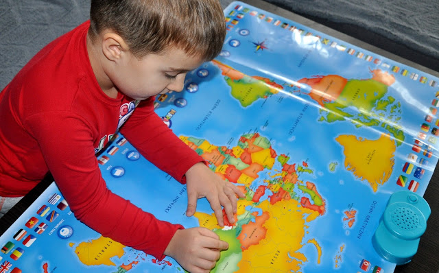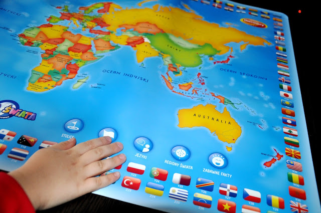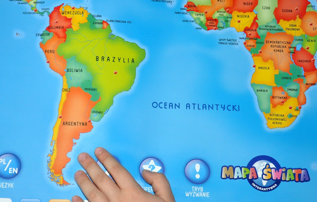 Jest to bardzo fajny pomysł na zabawę połączoną z nauką. Na dużej MAPIE ŚWIATA zaznaczone są Państwa, a przy nich maleńkie gwiazdki. Po naciśnięciu jednej z nich słyszymy nazwę danego kraju. Możemy też poznać ciekawostki i anegdoty związane z danym regionem, dowiedzieć się w jakim języku mówią mieszkańcy danego Państwa, co jest stolicą kraju i jaka jest jego flaga.