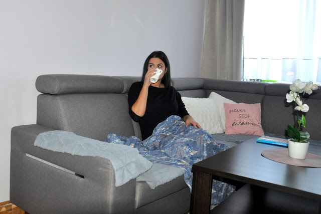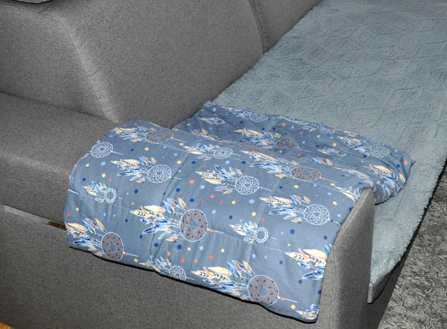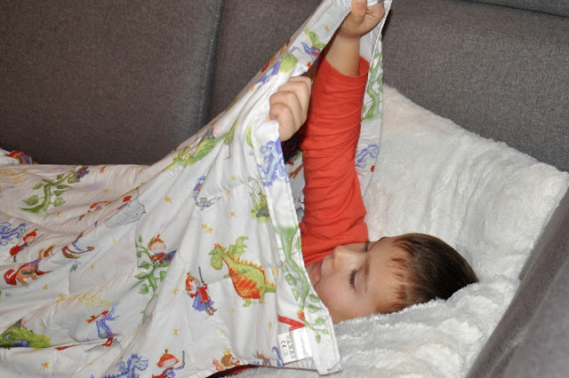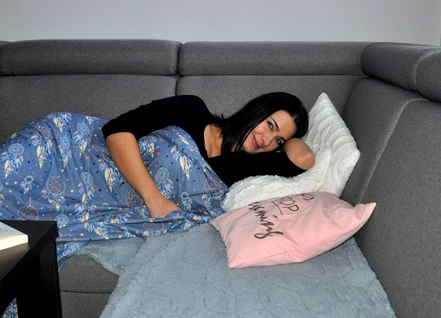 To samo jest z nami. Uwielbiam swoją kołdrę obciążeniową. Kiedy Julcio już śpi, a ja mam czas na odpoczynek, kładę się w dużym pokoju, przykrywam bardzo ciężką kołdrą i odpoczywam – z książką, filmem, muzyką, czasem i z laptopem. I mnie zdarza się pod nią zasnąć – nie w łóżku, a na narożniku 🙂 Kiedy już przenoszę się do sypialni, często zabieram pościel ze sobą, a to nie jest takie łatwe, bo jest naprawdę bardzo ciężka (jest uszyta dla dwóch dorosłych osób).