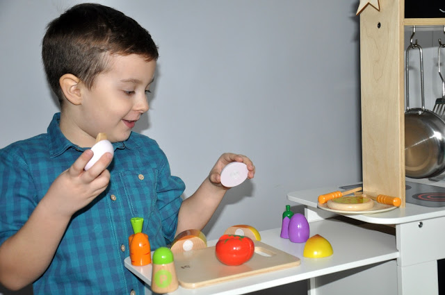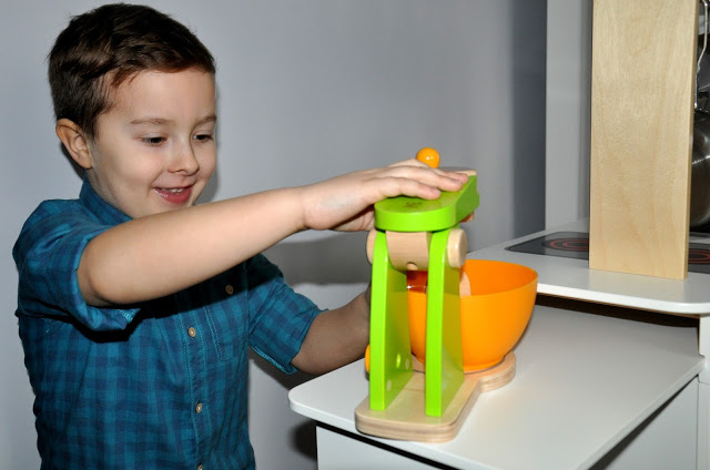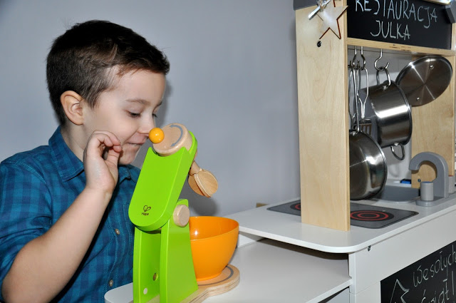 Kilka miesięcy temu uczestniczyliśmy w warsztatach kulinarnych, które prowadziła Julka Cymbaluk, zwyciężczyni ostatniej edycji MasterChef Junior – zobaczcie TUTAJ. Po tym spotkaniu nie miałam nawet najmniejszej wątpliwości w to, że mój 5-letni synek naprawdę uwielbia gotować! Był zachwycony wyrabianiem ciastka, układaniem składników na pizzy, przygotowywaniem koktajlu warzywno-owocowego. Po powrocie do domu przez kilka dni stale powtarzał, że kiedy dorośnie zostanie kucharzem i będzie nas zapraszał do swojej restauracji :)Jego marzenia powoli zaczynają się spełniać i może nie ma jeszcze swojego wielkiego lokalu, w którym może przygotowywać prawdziwe posiłki, to ma cudowną, drewnianą kuchnię Hape, w której czuje się przynajmniej jak MasterChef 🙂