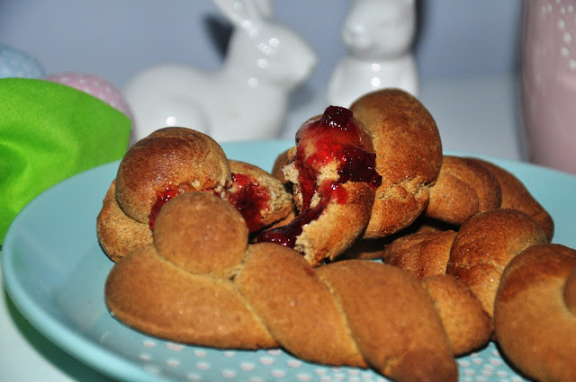 Bułeczki są pyszne same w sobie, ale z konfiturą żurawinową i ciepłym mlekiem smakują dosłownie obłędnie! Warto odłożyć przynajmniej jednego króliczka do koszyczka wielkanocnego.