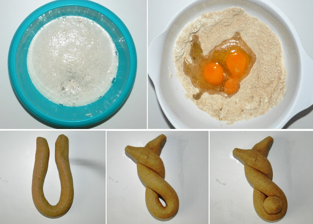 Po tym czasie ciasto na bułeczki jest gotowe i można zabrać się za robienie bułeczek. Z ciasta odkrywamy niewielki kawałki, z których formujemy rulon. Zginamy go na pół i skręcamy króliczki, na końcu dodając ogonek.