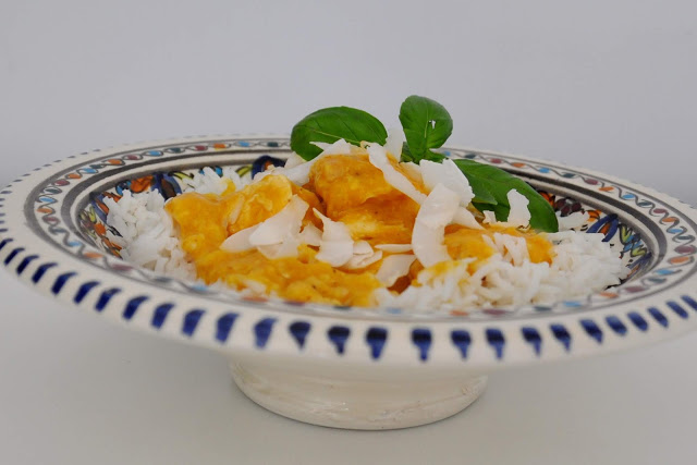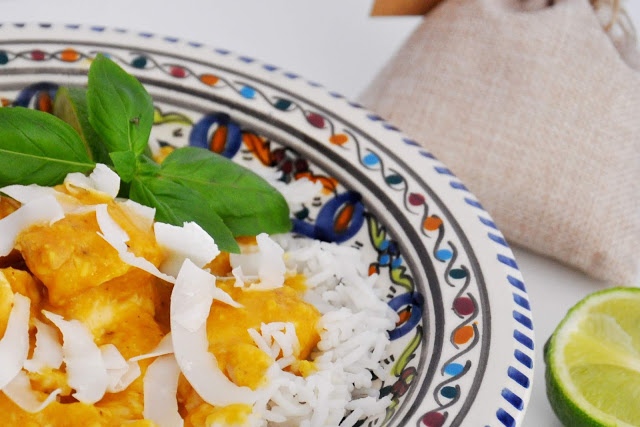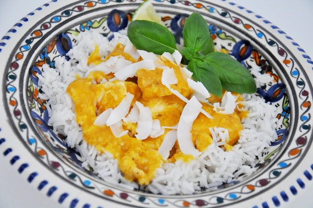 Kurczaka w sosie wykładamy na talerz z ryżem, dekorujemy bazylią lub kolendrą i posypujemy chipsami kokosowymi. Proste, prawda? :)Obiad wychodzi pyszny, bardzo aromatyczny i delikatny. Znika z talerzy w mgnieniu oka!