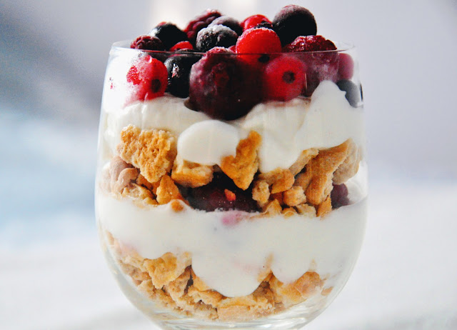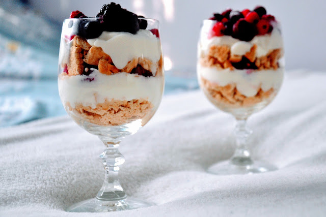 Na sam spód wsypujemy pokruszone ciastka, na to serek waniliowy i owoce. Kolejna warstwa jest dokładnie taka sama, a górę kończymy owocami.